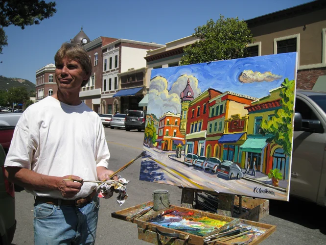 Once again the Michigan winters became too limiting for a landscape painter and the Christensens moved to San Luis Obispo, California in 1998. The Central Coast area of California offers a wide variety of subject matter for Mr. Christensen and the climate permits painting on location almost daily year round. He and his work were warmly received in California where he soon found galleries to exhibit his work. He was rewarded with a large, prestigious exhibit at the San Luis Obispo Art Center in June 2002, entitled "From Where I Stand". Christensen became a regular participant in local exhibits, winning awards in both watercolor and oil painting exhibits in Paso Robles and San Luis Obispo, as well as teaching workshops in the area. He also became a regular participant in the burgeoning plein air scene, gaining accolades in plein air festivals in San Luis Obispo, La Quinta, and Carmel. In March 2004, he was the artist in residence at the beautiful Inn at Morro Bay where a large exhibit followed, "Bigger, Bolder, Brighter". His paintings have been featured on the cover of the Daniel Smith catalogue and written about in Artist's Sketchbook Magazine, as well as in local newspapers. He is the founder of a bold new group of painters, The New Fauves, committed to propagating the style of the great French Fauve painters.